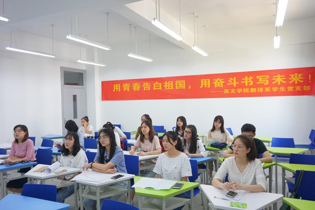 翻译系学生党支部书记从民族视野、世界格局和青年视角三个层面剖析了“时代”的深层内涵,结合自身实际出发,用亲身体会真诚告白新时代伟大祖国。学生党员们则结合暑期的志愿活动、实习求职经历以及对近期时事热评的思考几个方面抒发自己的爱国情怀。学生党员潘卓彦从“爷爷的故事”讲起,以爷爷46年老党员的故事讲述新中国成立70周年来中国变化发展;学生党员李萍就“习近平总书记给中青年干部的讲话”谈及感想,认为我们党正面临着发展带来的机遇及变革所带来的挑战,在前进的道路上我们青年学子要时刻做好准备;学生党员万怡婷则针对近期香港问题,表示学生党员应具有家国情怀、理性思考、冷静处理,为祖国的和平统一与发展贡献自己的一份力量。