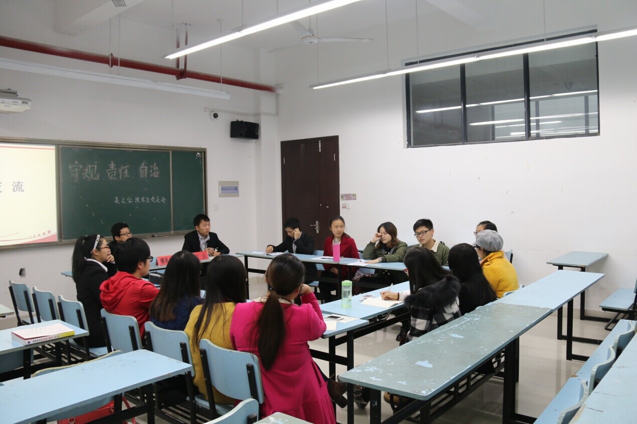 永利娱城app学生党支部举行了十八届四中全会精神学习会。学生党员以主题演讲的方式进行了心得交流,围绕“守规、责任、自治”这个主题发表了对于依法治国、依法治校、依规自治的认识,做一名严格遵守规范、担当法治社会责任、提升自我道德管理的守法公民。