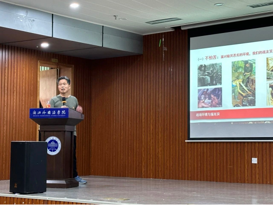 省新四军宣讲团副团长、自卫反击战参战老兵、原浙报集团党工委副书记许佳文受邀为全体入党积极分子讲授党课《弘扬老山精神,谱写新时代先锋之歌》。他通过自己的战斗经历,生动地阐述了老山精神的“三个不怕”:不畏艰难困苦、不惧生死考验、不计个人得失。许佳文呼吁大家要利用自己所学,为祖国建设贡进一步坚定了共产主义信仰。本次开班仪式在热烈的掌声中圆满结束,通过本次培训,学员们在思想上、行动上又向党组织迈进了一步。新时代是奋斗者的时代,希望各位入党积极分子把思想和行动落实到学校党代会提出未来五年的努力目标上来,为推进新时代新征程学校高质量发展新篇章贡献力量。
