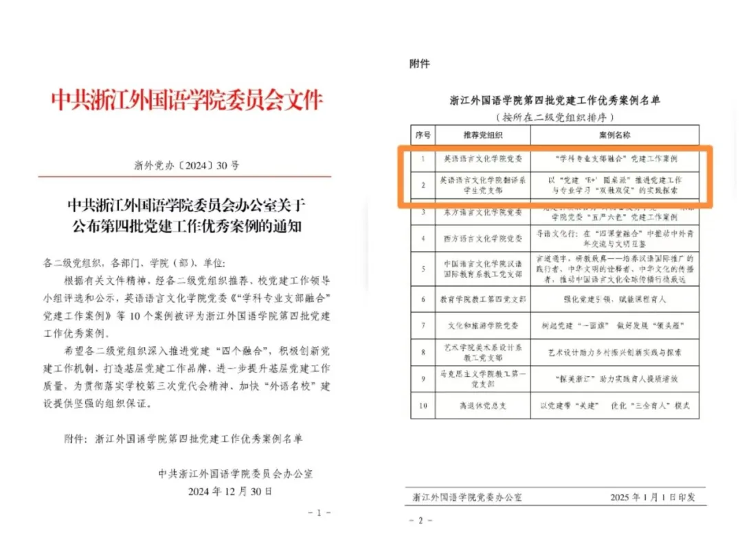 近日,永利娱城app党委的《“学科专业支部融合”党建工作案例》、翻译系学生党支部的《以“党建‘E+’”圆桌派推进党建工作与专业学习“双融双促”的实践探索》获评学校“第四批党建工作优秀案例”。