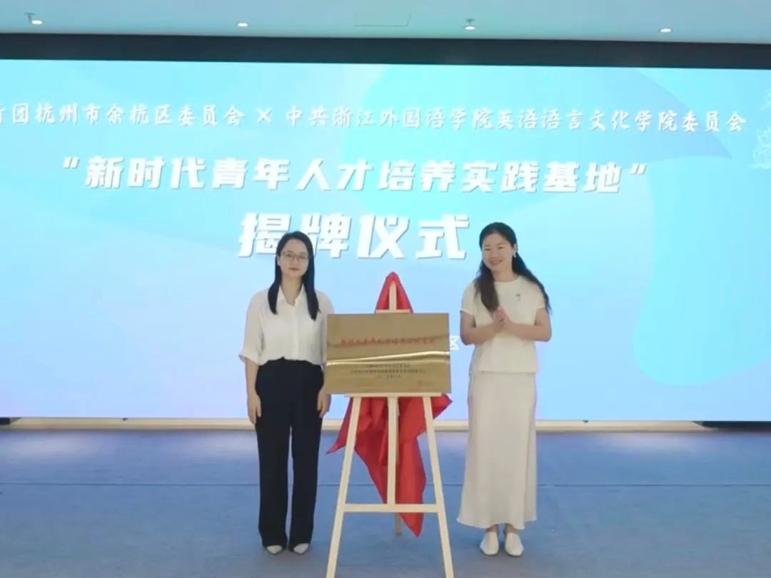 罗昕璐和田俊杰共同为共青团杭州市余杭区委员会与中共永利娱城app英语语言文化学院委员会“新时代青年人才培养实践基地”揭牌。