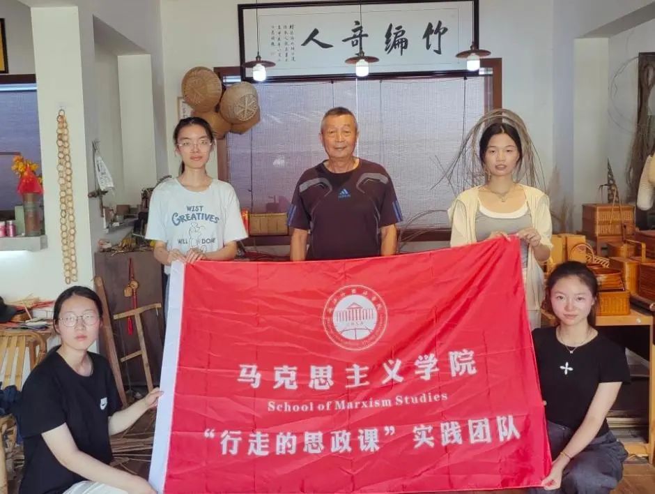 团队来到安桥头村参观当地彩绘稻田,欣赏稻田景观和水乡风韵。随后,当地讲解人员冯女士带领成员来到祝福广场、竹弶广场、鲁美动漫基地、手工编织店等地,讲述安桥头村在挖掘、结合“鲁迅外婆家”这一历史文化资源中做出的创新和努力。“我们的祝福广场以《社戏》为原型打造,传统社戏中,唱戏演员和本地观众在岸上,外来听戏的游客坐在乌篷船中欣赏。”冯女士这样介绍到。过程中,成员们还与当地竹编手艺人交流沟通,用照片记录探访过程,体会鲁迅笔下美好而温暖的外婆家,感受他对乡土、童真的深深眷恋。