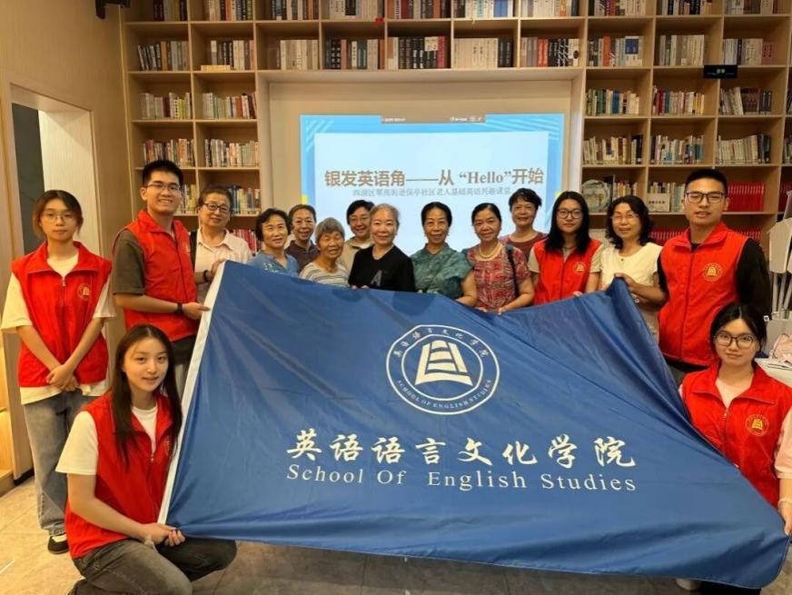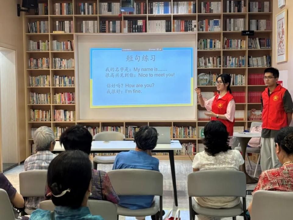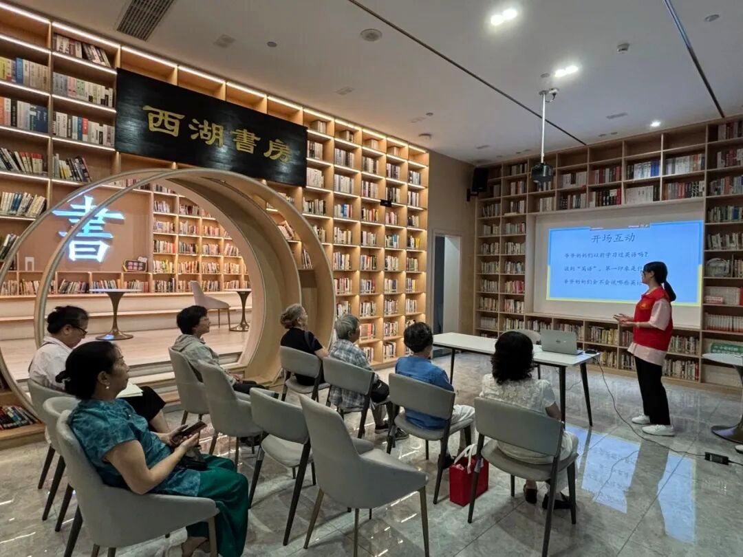 近日,“银龄乐学”永利娱城app赴西湖书房实践团走进西湖区翠苑街道保亭社区西湖书房,开展了一场别开生面的“银发英语角”主题活动。团队成员充分发挥英语专业特长,为社区老年居民带来了一堂精彩纷呈的英语启蒙课,用实际行动践行新时代青年的社会责任与担当,助力老年教育共富与精神共富。