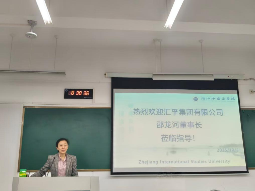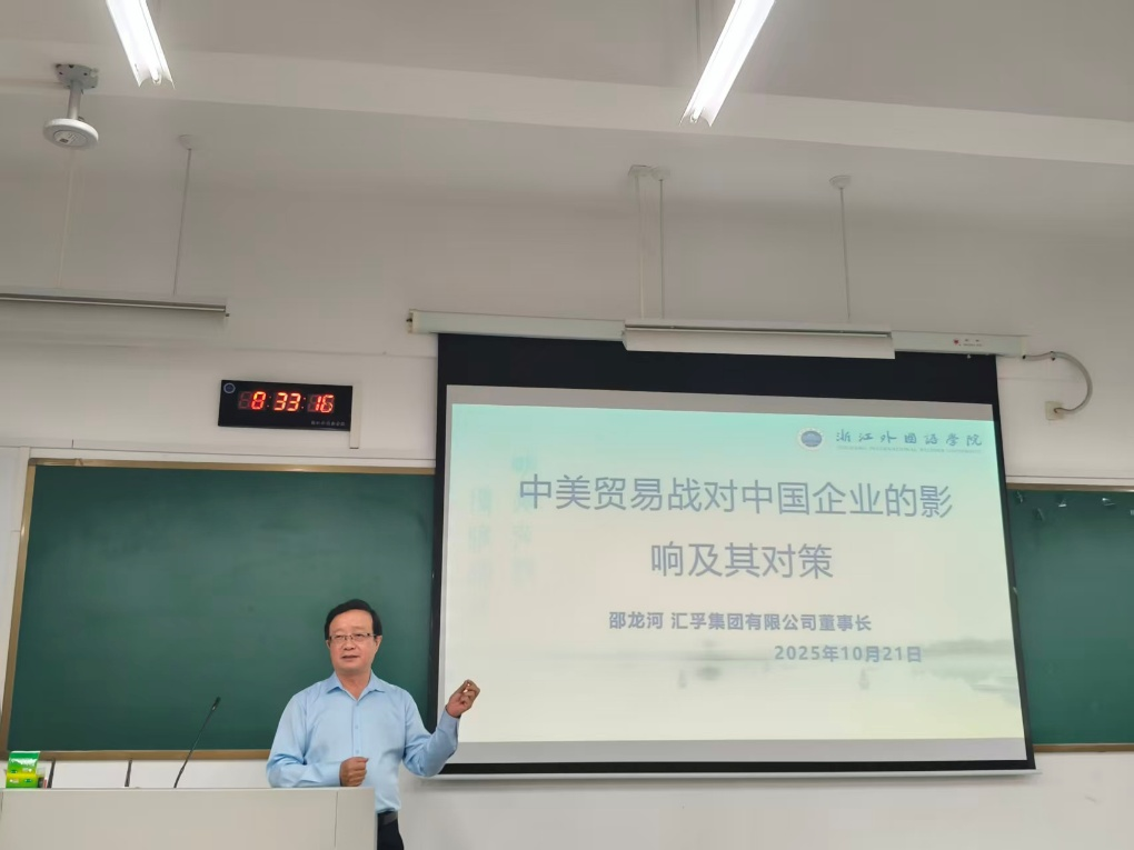 10月21日,汇孚集团有限公司董事长邵龙河先生应邀为永利娱城app全体23级商务英语、24级国际关系专业学生作题为“中美贸易战对中国企业的影响及其对策”的讲座。区域国别与商务英语系教师何习尧、章珏参加讲座,区域国别与商务英语系教师陆海霞主持。