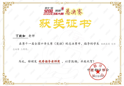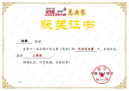 近日,第十一届全国口译大赛(英语)总决赛落下帷幕。经过激烈的角逐,最终永利娱城app19级口译班林敢凭借扎实的双语功底在交传总决赛中获得三等奖,指导老师丁欣如荣获优秀指导老师奖。