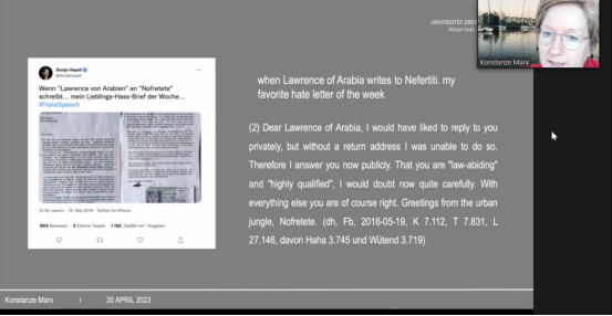 Marx教授还分析了后续交流(即评论区),探讨语言暴力事件中反击的有效性。教授指出,网友评论的方式与发帖者所采用的应对语言暴力事件的方式存在一致性。例如,在一个案例中,受害者特别标注了某句有语法错误的侮辱言论,在评论区中则出现了很多模仿该语法错误的评论。最后,Marx教授引用一段话总结探讨暴力话题的目标:“我把威胁公之于众,目的是不让那些发声的人被仇恨和煽动所掩盖。这不仅与知名人士相关,也与许多其经历仍然不为人知的人相关。”许多有影响力的人分享自己所经受的暴力事件,不仅使暴力变得清晰可见,更重要的是,许多难以被关注到的人也可能因此获益。