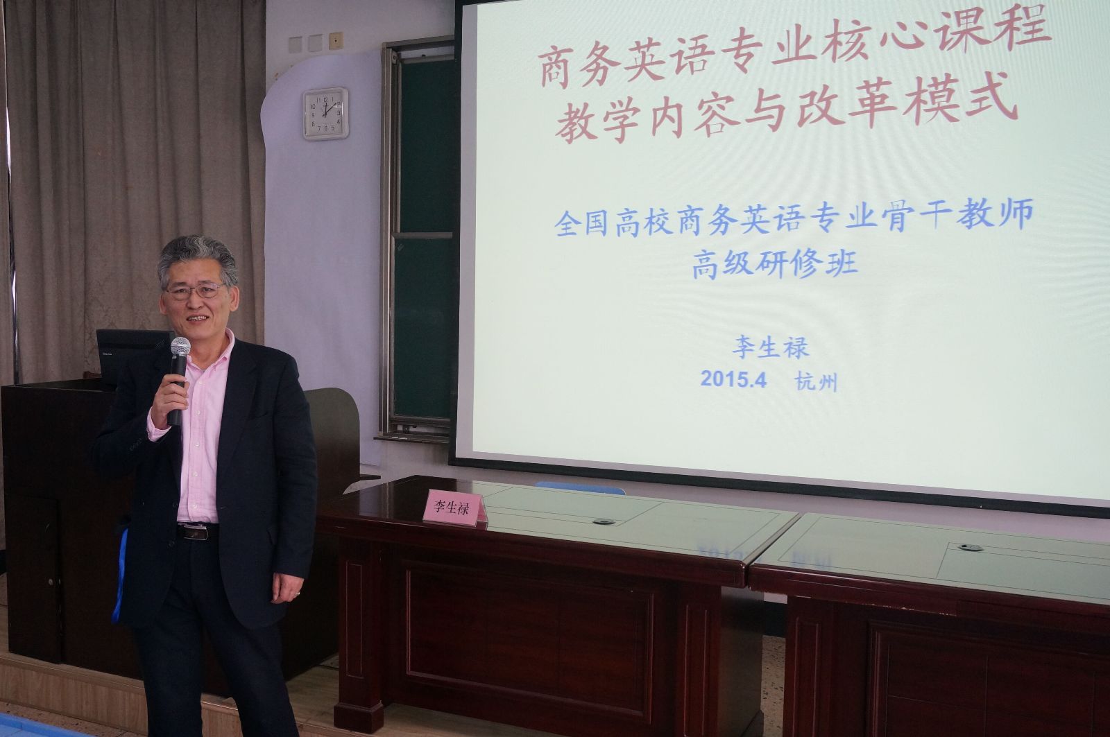 近日,“2014年全国高等学校外语教育中青年骨干教师高级研修班”在杭州举行。我校英语语言文化学院李生禄教授应邀担任研修班主讲,并就《商务英语国家标准》下的商务英语核心课程设置、教学理念、教学内容设计、教学方法、课程评价体系、课程实践、教学模式改革与创新实践等方面作了“商务英语专业核心课程教学内容与改革模式”的专题报告,受到了与会专家与教师的高度评价和关注。