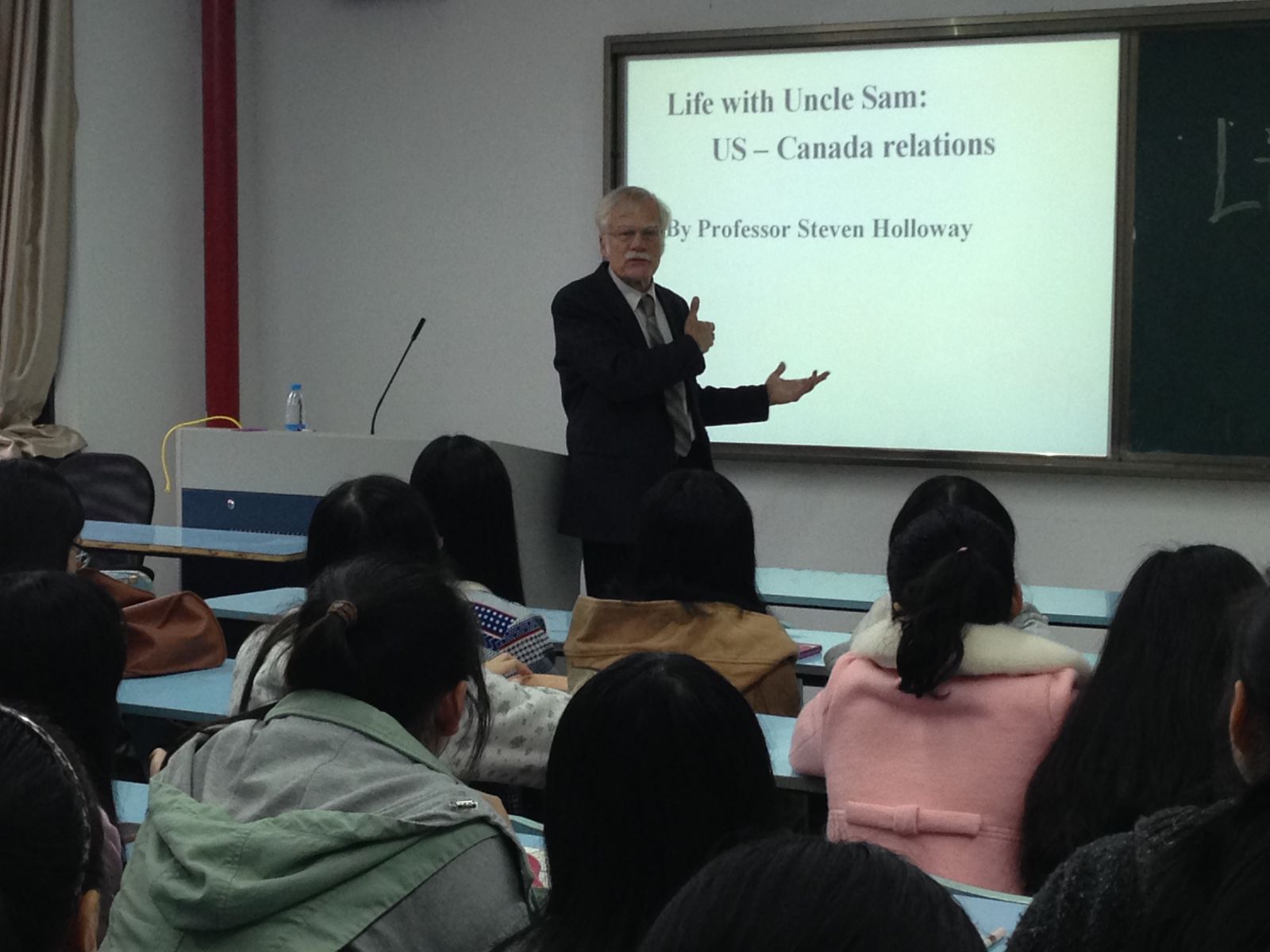 11月21日、24日,来自加拿大的教授Steven Holloway为学生作了两讲以“Life with Uncle Sam:US-Canada Relations”为主题的美加关系知识讲座。Holloway教授围绕美国-加拿大的关系特点展开论述,向同学们详细地介绍了美国与加拿大在历史、政治、贸易、文化等多个领域的密切关系。教授渊博的学识和幽默的言谈赢得了同学们的阵阵笑声与掌声。
