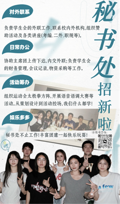 加入我们,你将收获…1.与各类人群沟通交流的机会,锻炼提高你的社交表达能力!2.策划活动、中控场控的机会,提高你的组织协调能力!3.来自不同年级专业的好伙伴,收获心照神交的友谊!4.高超的office、Adobe等软件的应用能力,为你将来的工作筑实地基!5.优秀的校园组织经历,为你的简历添砖加瓦!秘书处欢迎你!希望你比浙外的秋天先到来!