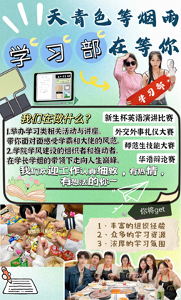 欢迎来到我们的中转站——博学院(学习部)!这趟专列的车厢里,充满了智慧的光芒和求知的渴望。在这里,每一段旅程都是对知识的探索。学习部是学风建设的主力,负责院内学习制度的监督;开展各类学术讲座以及经验分享会,提高同学们的学习积极性和主动性;开展师范技能大赛、辩论赛、演讲比赛、翻译比赛、晨读打卡、云端自习室等学习型活动,营造积极向上的学术竞赛氛围,为广大学子创造优良的学习环境,督促大家养成良好的学习习惯。这里是一个能显著提升自我的平台,也是一个沟通教与学的桥梁。