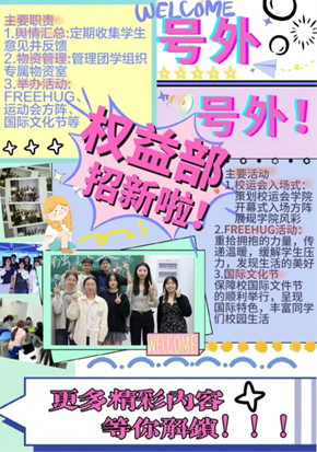 权益部作为物资室管理部门,负责管理团学组织的所有物资,同时也协助其他部门举办活动,提供必要的物资支持和后勤保障服务。除此之外,权益部还承担着重要的舆情收集和汇报工作。我们会密切关注学生群体的意见和反馈,及时反馈给学校领导和相关部门,为学生争取更多的权益和福利。部门也以学生为出发点举办过多项活动,致力于为全体师生服务。