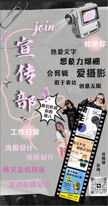 我们穿越光影交错的隧道,来到了终点站。这是我们的映象院(宣传部)——创意与美学的交汇点。他们用色彩和构图讲述故事,用视觉艺术捕捉校园的心跳。宣传部是学生会宣传的骨干部门,也是展示学生会风采的窗口,学生会的任何活动都离不开宣传部背后的默默奉献。活动的摄影海报易拉宝的制作、视频的剪辑、公众号推送的撰写与排版是我们创意与技术的结晶。如果你想要发挥天马行空的想象力,展示强大的宣传功底,就来加入这里吧!期待与富有才华的你相遇。