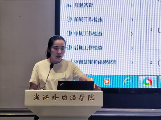 俞海燕演示了毕业论文(设计)管理系统的操作,重点提醒学生在系统截止时间前提交相关资料;她还要求学生在上交资料前反复核查,规避低级错误,提高材料的规范性。
