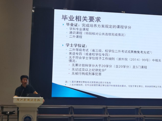 虞峰峰详细说明了毕业证和学位证所需达到的条件,提醒同学们关注培养方案完成情况、通识课程学分情况、二外等级考试情况以及处分撤销情况。