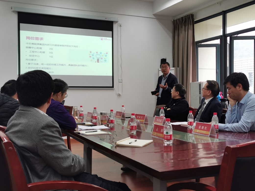 乐博能源集团(杭州)有限公司总经理虞朝林与我院党政领导就人才创新培养、实习实践、校企合作、学生就业等方面进行了深入交流。院长蒙兴灿表示,与乐博能源建立校企合作是实现校企双赢的有效方式。近年来,我院生源质量不断提高,毕业生的社会认可度显著提升,非常期待与优质企业进行深度合作。商务英语系主任高伟介绍了人才培养方案制定和专业课程设置的相关情况。