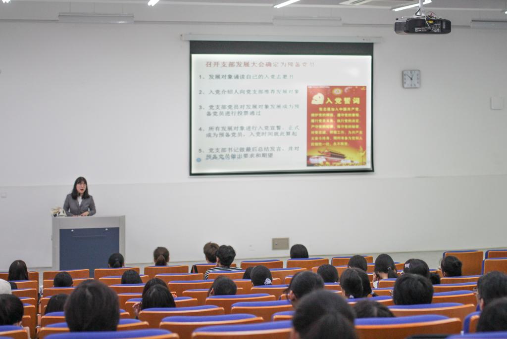 大会上,吴老师耐心细致地为新生介绍了大学生的入党条件及要求。从递交入党申请书、被团组织推优成为入党积极分子到成为发展对象,再到参加发展对象培训班、进入预备党员。要成为一名真正的党员需要经过重重选拔,并且不断磨砺、提升自我,才有机会做中国特色社会主义事业的可靠接班人。