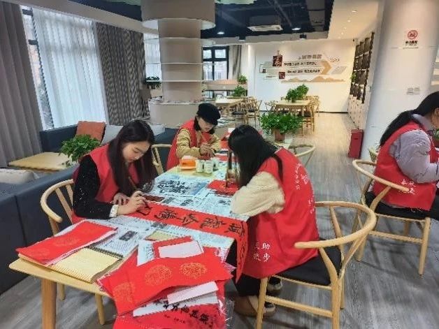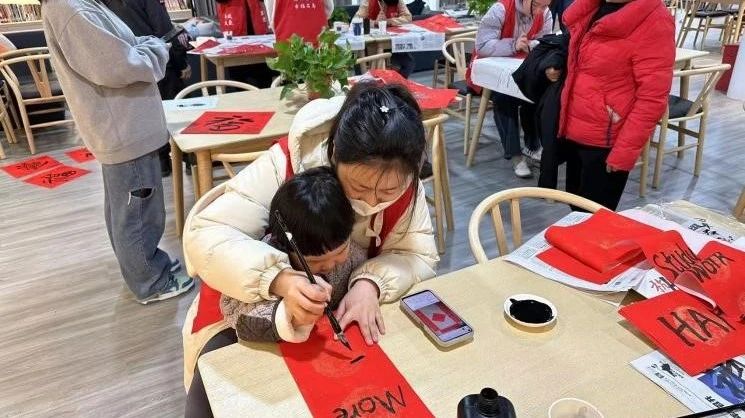写春联是中国传统文化中的一种活动,人们会选择吉祥的词句,用墨水抄录于红纸之上以表达祝福与美好的期盼。这次活动不仅有“阖家欢乐纳千祥,和顺门第增百福”“金龙献瑞苏千里,绿柳迎春乐万家”等传统对联,还特别加入了英文元素,志愿者和社区的孩子共同执笔写下了“Eat well sleep well have fun day by day;Study hard work hard make more money and more”等对联。英文对联是对中国传统对联的创新,是一种跨文化交流的艺术形式,是连结不同文化、增进文化认识和理解的纽带。通过欣赏和创作对联,在场人员不仅体验到了文字语言的美妙与乐趣,也感受到了中国的年味儿!