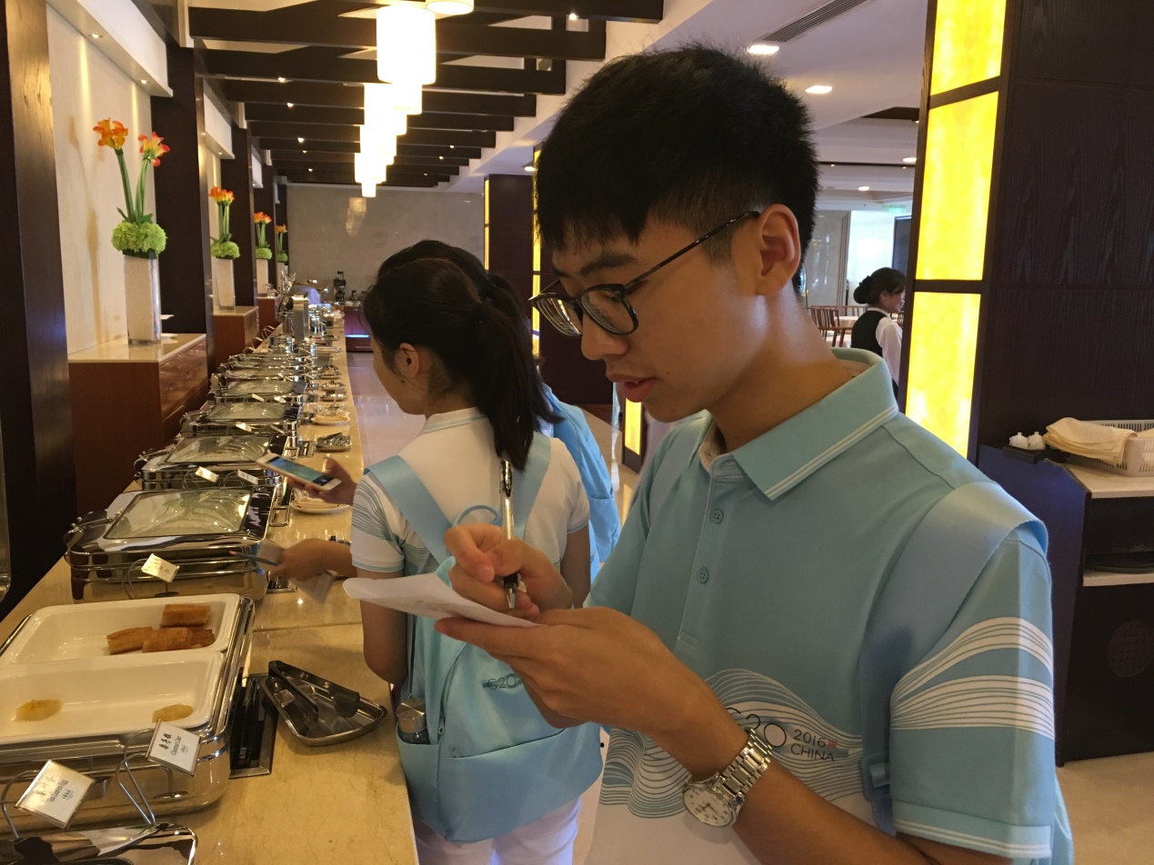 曾经听到过这么一句话,“无志愿,不青春”。很高兴我有了一个新的身份——小青荷。这次峰会我所服务的岗位是浙江西子宾馆的外宾用餐区。在这里度过的四天,我们过得充实而有趣。9月4日,是我志愿服务的最后一天。整一天,浙江西子宾馆的节奏似乎都比往常要快,大家紧张而有序地为晚上的欢迎晚宴做准备,大家那么久以来的准备都是为了这一天完美的展示。如预期所想,这一天也会是最累的一天。回想起来似乎站了整整5个小时,但是却觉得这短短几个小时是那么的珍贵。对着每一位外宾问候一句“good evening”,他们同样会礼貌地向你致意;帮助客人解决他们遇到的“麻烦”;有时还会有热情的宾客上前主动来和我交流……一晚上的工作氛围都是轻松愉悦的,我也不再像一开始那么紧张。服务结束后,内心充满了成就感,哪怕只是帮上了一些微不足道的“小忙”,我也觉得这么久以来的付出是值得的。
