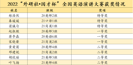 近日,2022“外研社·国才杯”全国大学生英语演讲大赛网络赛场落下帷幕。在楼翎和夏国建两位老师的悉心指导下,经过激烈角逐,永利娱城app的郑浩然、秦媛媛、梁議匀同学荣获特等奖并成功晋级全国总决赛。同时,还有7名同学分别荣获一等奖、二等奖。