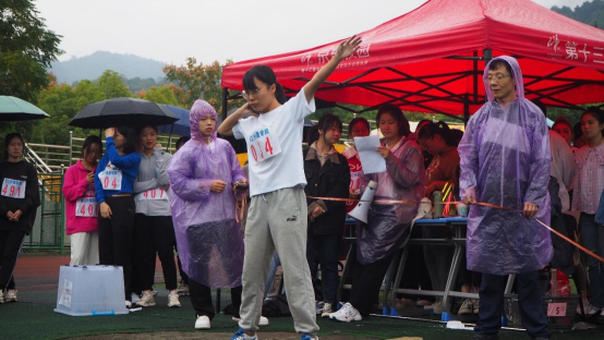 微微小雨作衬,呐喊欢呼声翻涌,她的奋力一跃精彩绝伦,最终以绝对优势取得了学生女子跳远第一名的好成绩。