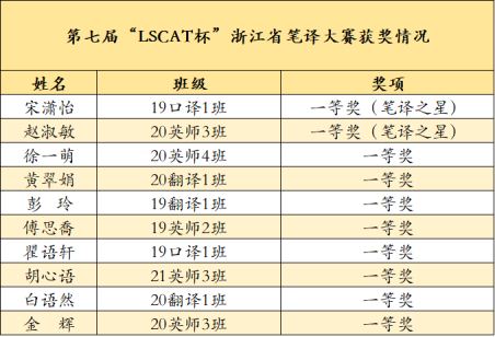 近日,第七届“LSCAT杯”浙江省笔译大赛结果公布。学院学子表现出色,在英译汉、汉译英两个组别中共斩获10个奖项。其中,19级口译1班宋潇怡获得英译汉组第一名,20级英语(师范)3班赵淑敏获得汉译英组第一名,均获得“笔译之星”称号。