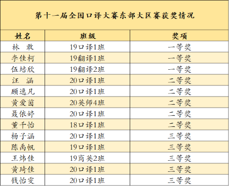 在第十一届全国口译大赛东部大区赛中,我院3位同学荣获一等奖,5位同学获二等奖,5位同学获三等奖。其中,19级口译1班林敢以总分排名第二的佳绩晋级全国赛。