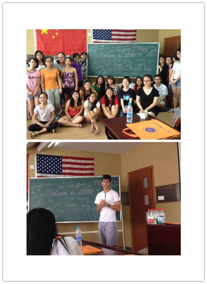 7月中旬,杭州终于出梅,抛开了持续的阴雨,7月16日的杭城活力四射。时钟指向九点,载着美国学生的大巴准时开进浙外本部的校园。原本轻声谈笑的我们几乎立刻安静下来,一致目光灼灼,紧盯巴士的大门。门,看似漫不经心地开了。不得不说,即使已做了很充分的心理准备,我还是很难接受曾经的炎黄子孙们现在竟说了一口非当地人基本不可能说的地道美语。皮肤还是黄色的,眼睛还是黑色的,然而一些东西却已经大不一样了。要问她们的气质?是火吗?对,火,她们就像是燃烧的火焰,跳跃着,飞舞着;她们是活力四射的火蝴蝶,忽闪忽闪,好像要从你的眼睛一直飞到你的心里。走在夏日的校园,我们一一为美国友人介绍着浙外的本部校园。蝉声震天,中美的学生们就在这样的情形下,相识了。10点左右,我们移步图书馆,陶老师致了欢迎词,大家互作介绍,很是欢乐。