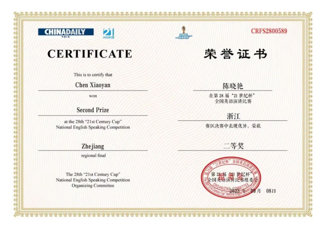 近日,“21世纪杯”全国大学生英语演讲比赛浙江省赛区决赛圆满落下帷幕。在楼翎老师和夏国建老师的悉心指导下,永利娱城app21英语6班伍桢颖在决赛中获得亚军,并顺利进入全国总决赛!21商英1班陈晓艳在决赛中荣获二等奖!