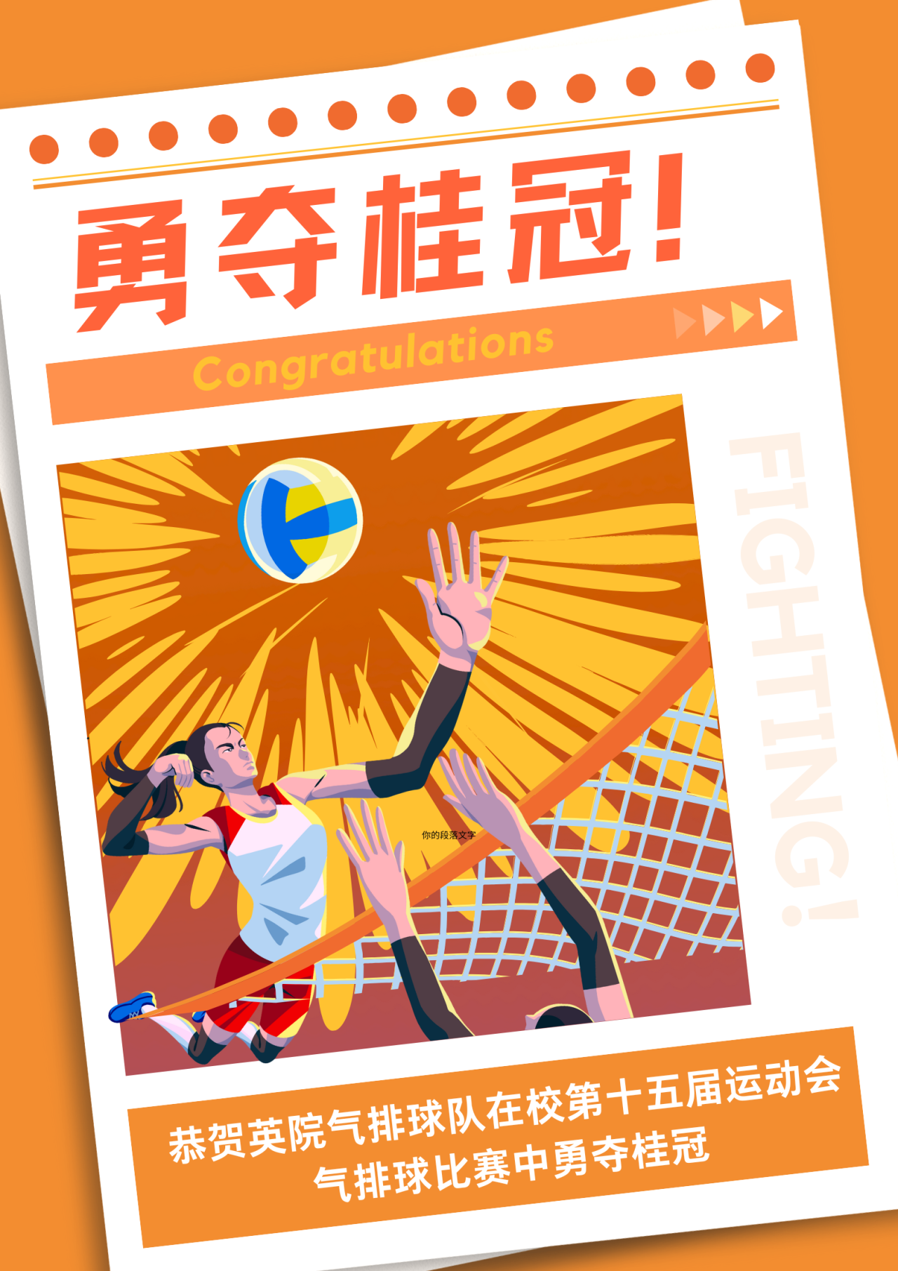 冠军的荣耀之旅,虽然在此暂时画上了句点,但气排球的热血与激情却永远不会退场。每一次精准的发球、每一次有力的扣杀,都是团队力量和坚定信念的凝聚。这一场场胜利,是全体队员辛勤汗水的凝结,也是对他们不懈努力的最好嘉奖。愿队员们将赛场上那份永不言弃的精神融入生活,勇敢地追逐各自的梦想,在人生的每一个‘赛场’上奋勇争先!