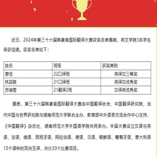 英文学子在“第三十六届韩素音国际翻译大赛”中荣获佳绩