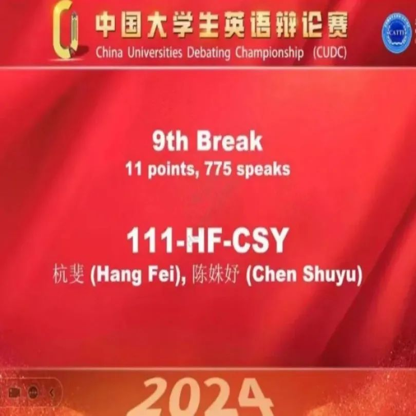 英文学子在2024“CUDC杯”中国大学生英语辩论赛全国总决赛32强淘汰赛中获全国总决赛一等奖、全国八强