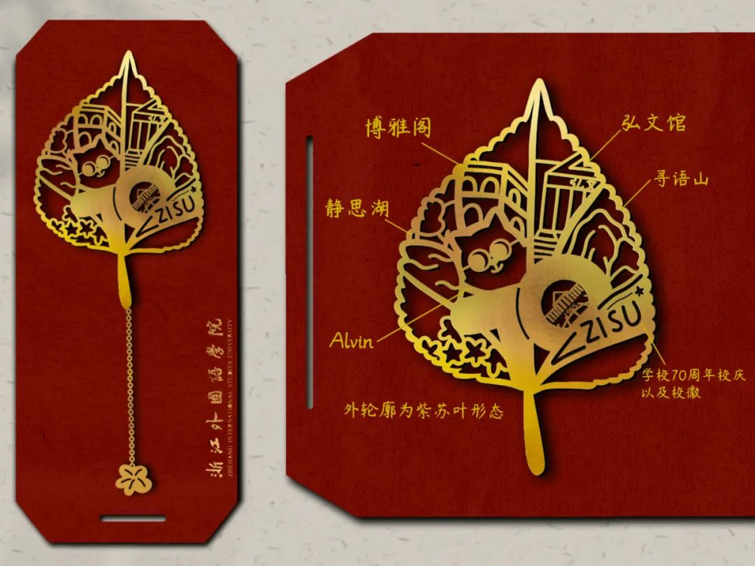 以紫苏叶为外形,融入了我校70周年校庆的字样以及校徽,英文名称缩写。同时融入了我校的标志性建筑与地点,如弘文馆,博雅阁,静思湖以及永利娱城app吉祥物Alvin,充分展现浙外特色和“弘德明毅,博雅通达”的校训。整体书签为金属质感,象征浙外70年的光辉历程。