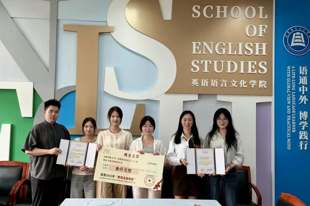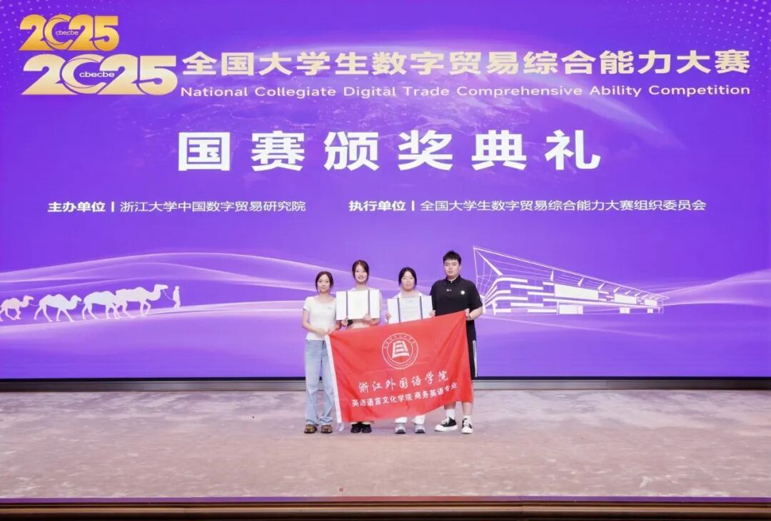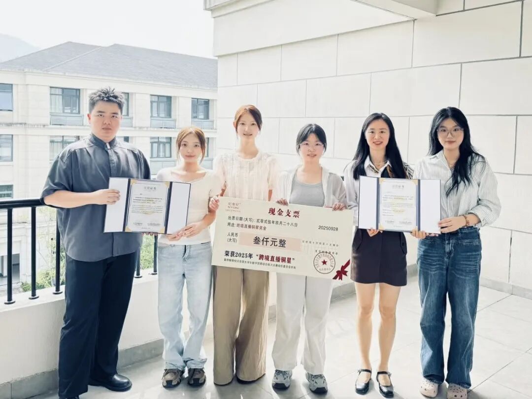 近日,2025年第四届全国大学生数字贸易综合能力大赛尼奥尼数字贸易跨境直播赛在永利娱城app圆满落幕。永利娱城app2023级商务英语专业的许峤琳、梁丞韬、周莹莹、金欣嘉、黄思甜五位学生首次组队参赛。在商务英语专业赵歆老师的悉心指导下,与全国百所高校数千名选手同台竞技,最终斩获全国总决赛“国赛一等奖”及“跨境直播铜星”的优异成绩,赵歆老师荣获“优秀指导教师奖”。
