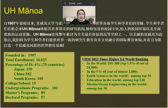 近日,永利娱城app举办了夏威夷大学马诺阿分校3+2本硕联合培养项目宣讲会,夏威夷大学马诺阿分校国际项目负责人Ivy Mu博士进行宣讲。
