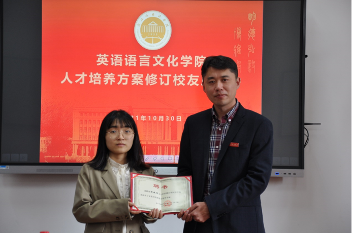 英语系系主任黄艳春对优秀校友们表示热烈欢迎,指出此次座谈会的目的:通过优秀毕业生的反馈与建议,为我院十四五规划与师范专业的认证工作提供宝贵意见。