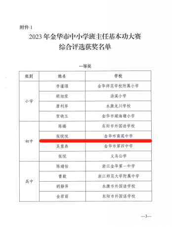 恭喜永利娱城app2016届英语(师范)专业校友张悦悦荣获金华市中小学班主任基本功大赛一等奖!