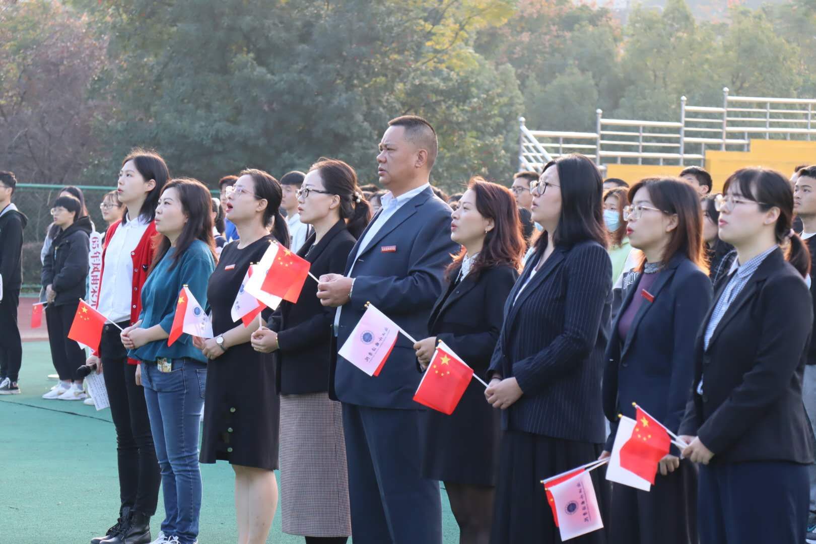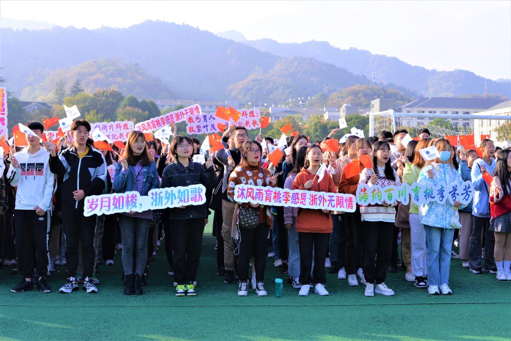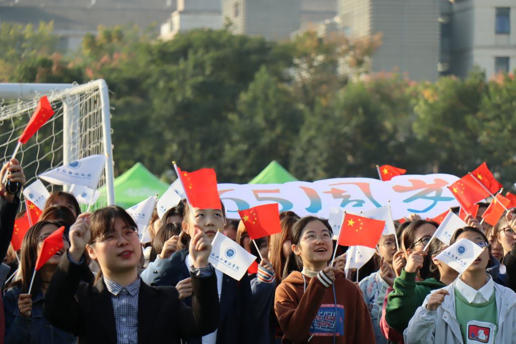 仪式尾声,所有同学都整整齐齐地站在操场上,面带微笑地挥舞旗帜,齐声摇旗呐喊:“浙外六十五周岁生日快乐!”旗帜飞扬,每个人都沉浸热情和欢乐之中。