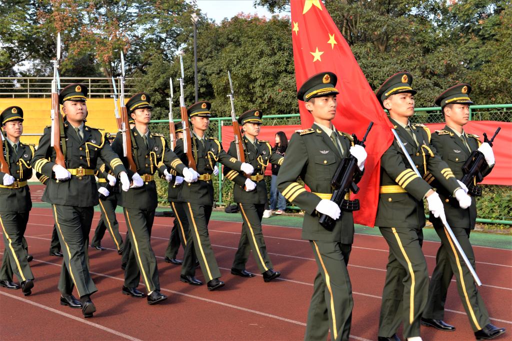 国旗护卫队在军令声中缓缓入场,每一次踏步、每一次挥扬、每一次口令齐响,是新生的榜样。随着升旗手坚定一挥,五星红旗迎风舒展,见证浙外生日快乐。
