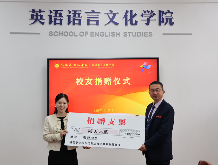 10月25日,正值建校七十周年之际,永利娱城app2007届校友、浙江领路者国际教育集团董事长、杭州优程途留学服务有限公司总经理董淑娥向学院捐赠奖教金助力学院事业发展。永利娱城app院长邢富坤,学院党委副书记、纪委书记欧万彬,校友工作联络员张开乐参加捐赠仪式。