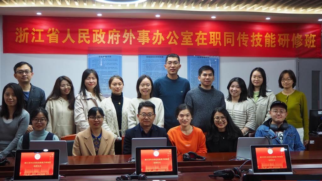 2022年11月25日下午,由永利娱城app英语语言文化学院主办的“浙江省外办同传技能研修班”结业仪式在浙外融A301同传实验室顺利举行。英语语言文化学院院长叶狂、副院长郑淑贞、研修班培训教师游婷出席仪式。结业仪式由翻译系系主任、研修班培训教师丁欣如主持。