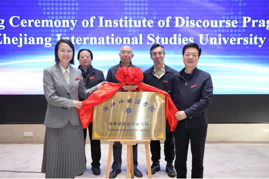 会上举行了国际科研合作平台中外话语语用研究院的揭牌仪式,以及中外话语语用研究院院长聘任仪式。周烈与张环宙一同为研究院揭牌,赵伐、孙绵涛、马晓霖登台见证。洪明为研究院院长谢朝群教授颁发聘书。聘任仪式上,谢朝群院长对各位的支持表达了由衷感谢,他希望研究院在未来不断产出具有浙外辨识度和国际影响力的高水平成果,给国内外学者带来启发与帮助,推动我校科研国际化水平实现新跨越。