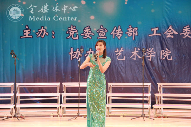 我院的才艺展演是由沃叶敏老师带来的越剧《西湖山水还依旧》,悠扬悦耳的歌声赢得了阵阵掌声。