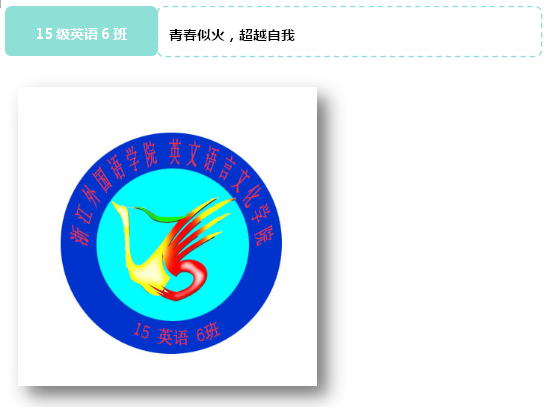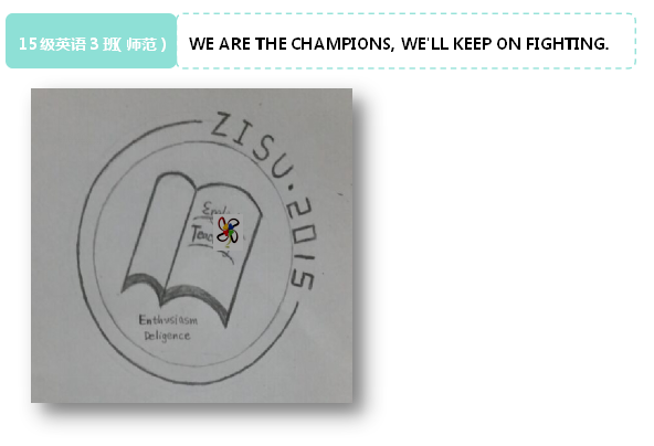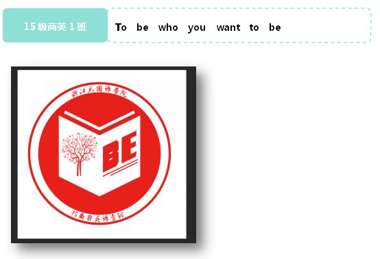 班徽介绍:2015夏,我们就这样不远万里因为缘分圈到了这个班级,在27人的大家庭中,有来自广西的伙伴,还有贵阳的直爽女生,还有来自河南的,来自温州,来自金华……这里的每个人都朝气蓬勃,富有激情,这是班徽采用红色底色的寓意。班徽的主体构成是一本书,左侧封面是一颗年轻的树木,希望班级里的每一个同学都能好好得在浙外校园里好好成长,他不是幼苗,也不是一颗大树,我们的大学生活还正在进行!右侧的封面指的是Business English的缩写,表明了我们的专业,其次和班级口号相对应(to be who you wanna be)。