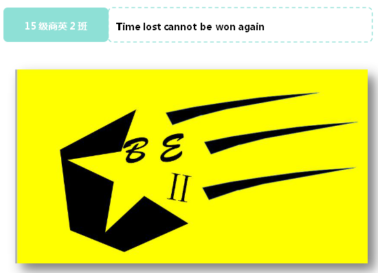 班级文化:15商英2班的成立宣告着27位同学走向了人生新的转折点,昭示着一个新的、友爱的、团结的集体的诞生!15商务英语2班由21位可爱的女孩子和6位男友力爆表的男孩子组成。他们有的在学生会甘为孺子牛服务学生大众,有的在记者团用相机和笔杆雕刻时光,有的在心理协会用耐心认真温柔了岁月,有的在班级里用笑声谱写了青春,有的在运动场上点燃了热浪。“Time lost cannot be won again”是我们班的班级口号。时光易逝,韶光难再。虽然还处于校园这座象牙塔中,但时刻不忘珍惜时光是我们的共识,也是我们对大学的认知,在这短短的四年里,无限拓展时光的宽度和深度,无愧于心。