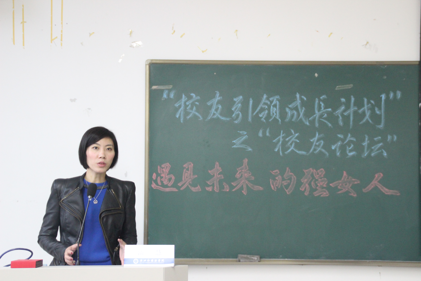 华通留学公司温州分公司创办者泮慧校友,与学生分享她如何成为一个强女人的心路历程,分享了创业之路的艰辛与收获。泮慧校友指出五点:一、尽早做好职业规划,在正确认识自我的同时了解未来工作的内容。二、学会学习,虚心借鉴前人经验,学尽其用。三、坚定实施,学会积累,涉猎广泛。四、建立良好的人际关系,善于沟通。五、合理安排利用时间,高效完成每一件事。在轻松的互动中,同学们都受益匪浅。
