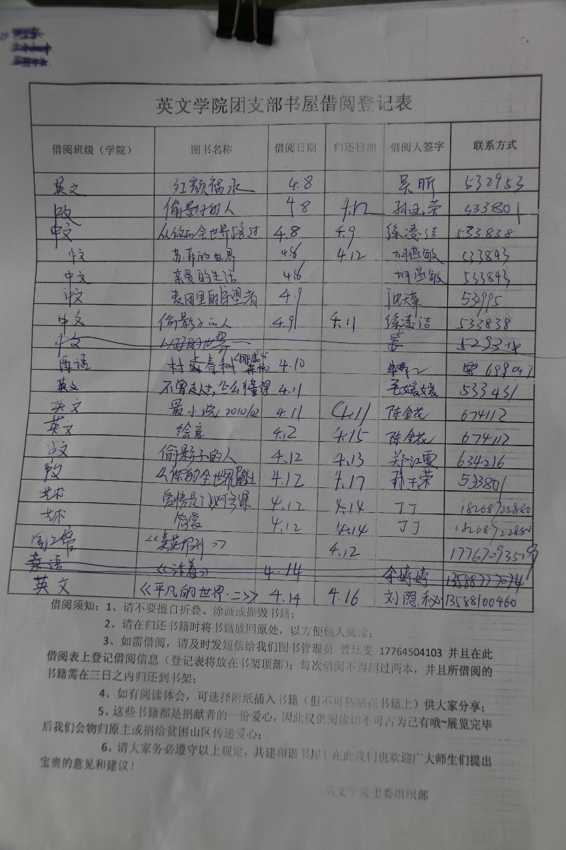 团支部书屋是英语语言文化学院团委的一项传统活动,倡导同学走下网络,拿起书本,培养阅读的好习惯。书本来自永利娱城app各个团支部的捐献,不仅有文学读本、英文原版小说,还有教辅用书等。这个在教学楼二楼通道上的小书屋,采用学生自己借阅自己登记的方式,提倡诚信。