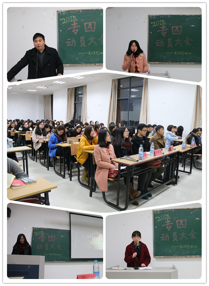 为帮助参加2015年英语专业四级考试的同学们调整心态,积极应战,深入了解考试的形式、特点及考试技巧,并以更高效率有针对性地投入到备考状态中,英语语言文化学院举办专四考试动员大会,永利娱城app党总支、英语系及学工办相关老师出席了此次动员大会。英语系副主任朱武汉老师向同学们详细介绍了考试流程,分享了英语学习的方法,鼓励同学们做最后的冲刺。在专四考试中曾取得不俗成绩的励颖、周琪炜同学作为朋辈交流,先后上台与同学们分享了她们的备考技巧和经验。另外,学院团委办公室还专门开展了“专四·抱抱团”的系列活动,为同学们顺利通过英语专四考试助力。