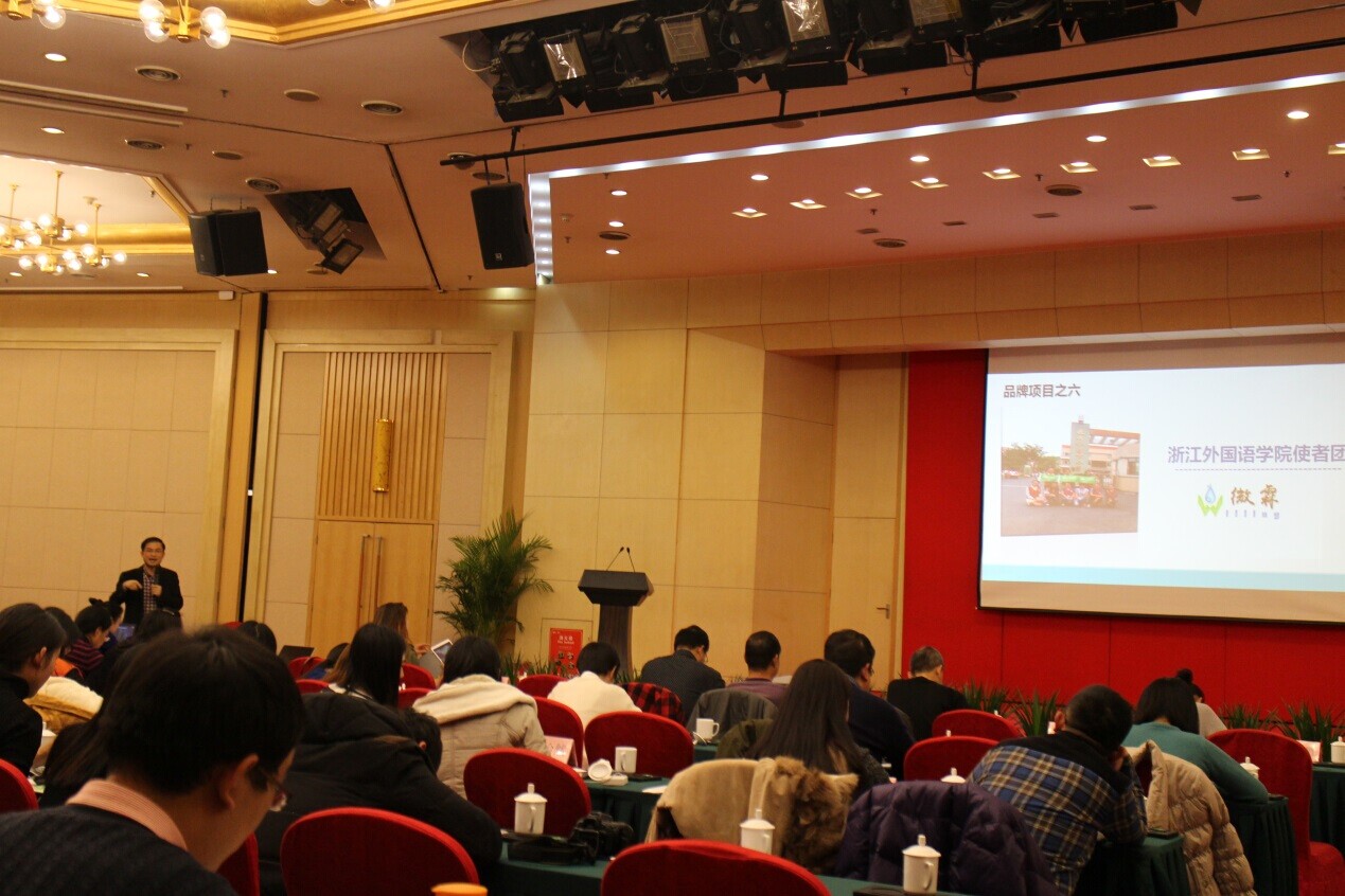 (图为浙江省环保厅团委书记虞伟介绍我校“英文载绿意·公益诉环保”品牌项目)