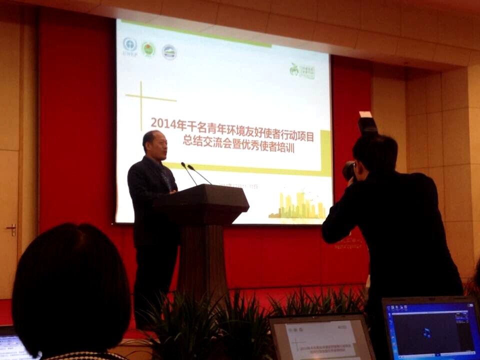 2014年12月11日至12日,全国“千名青年环境友好使者行动”项目总结交流会暨优秀使者培训活动在北京召开,来自全国的100余名优秀青年使者代表和50名项目代表参加会议。我校英语语言文化学院张英同学参与了此次会议,并与来自全国29个省市的优秀青年使者进行项目分享和交流。环境保护部宣传教育中心主任贾峰、共青团中央青年志愿者工作部党组书记侯宝森、全国政协人资环委办公室副主任逄春华、教育部思想政治工作司副巡视员俞亚东以及科技部、全国妇联、联合国环境规划署驻华代表处等单位代表出席会议开幕式,贾峰主任等领导致辞,环境保护部宣传教育中心副主任何家振主持开幕式。