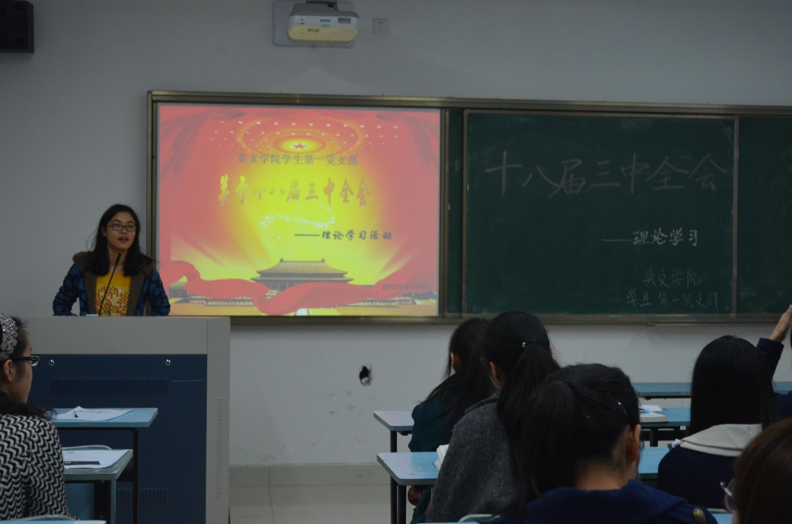 为更好地学习中国共产党第十八届中央委员会第三次全体会议的相关精神,学习会议改革要点及内涵,11月18日晚,英语语言文化学院学生第一党支部举行了十八届三中全会理论学习活动。全体学生党员、入党积极分子参与本次活动。